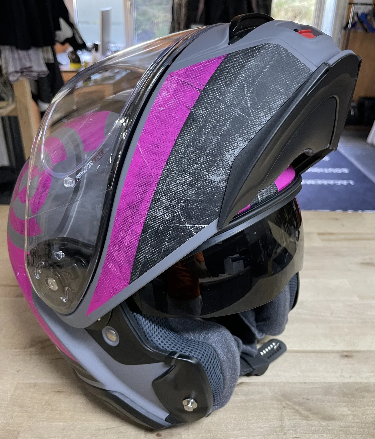 Nous vendons pour le compte de Christelle, un casque modulable Shoei Neotec II, en taille M. Le casque est proche du neuf, a été acheté en mai 2023 chez Vionnet au prix de CHF849.- (facture d'achat disponible). Il dispose de la lunette solaire, du pinlock sur visière et se ferme par clip.